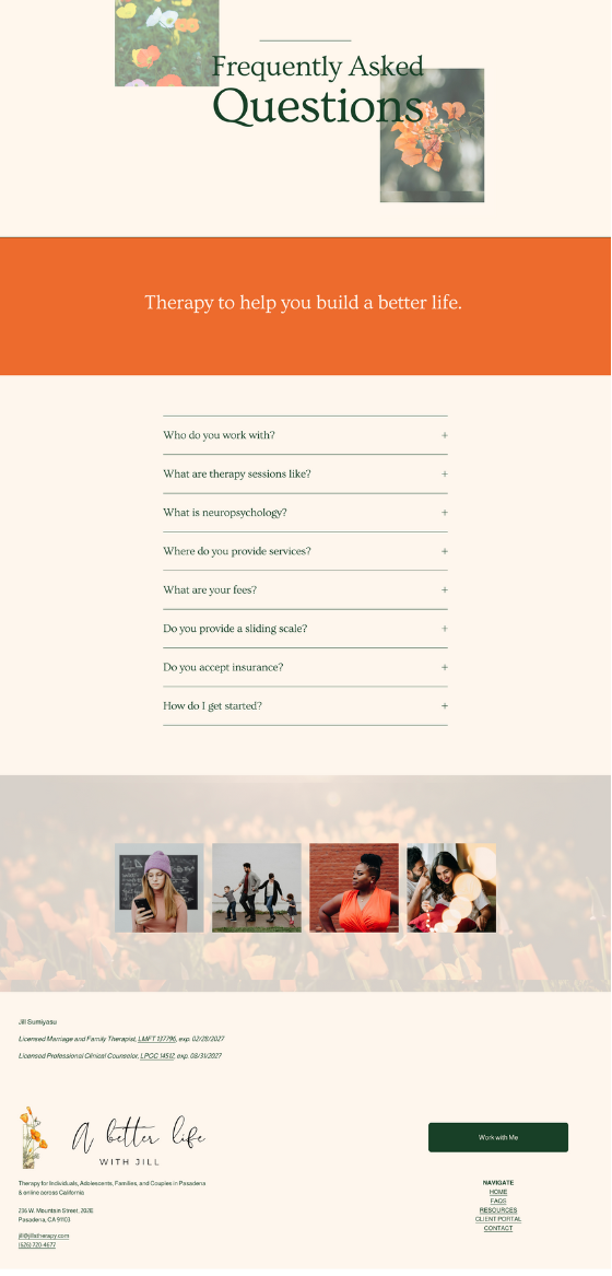 I created an FAQs page to share essential information about Jill’s practice — fees, insurance info, location of services, and next steps to begin therapy.